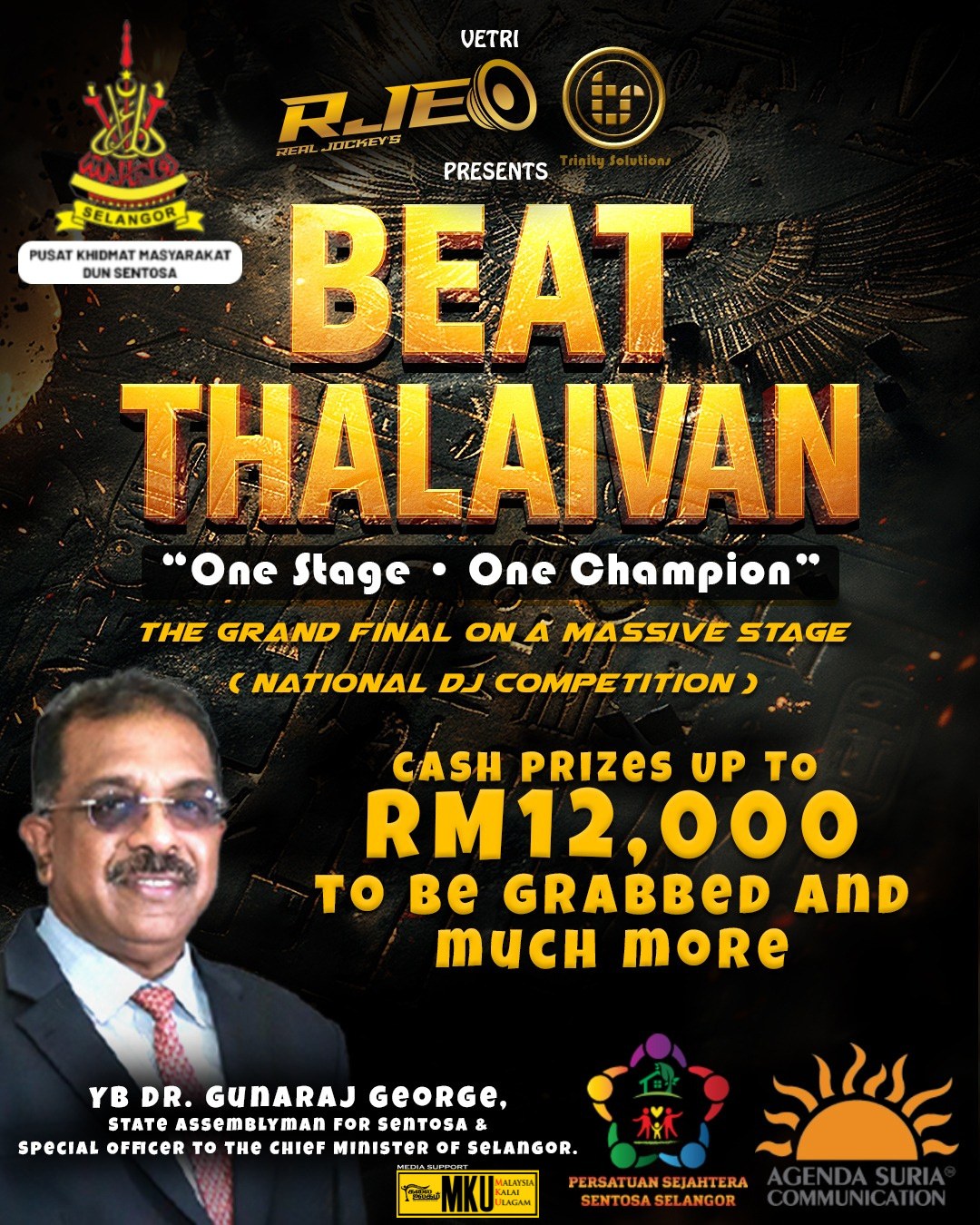 Sentosa தொகுதி சட்டமன்ற உறுப்பினரும், Selangor முதல்வரின் சிறப்பு அதிகாரியுமான YB டாக்டர் குணராஜ் ஜார்ஜ், இளைஞர் திறமைகள் மற்றும் படைப்புத் துறையின் வளர்ச்சியை ஊக்குவிக்கும் இத்தகைய மேடைகளின் முக்கியத்துவத்தை வலியுறுத்தினார். “பீட் தளைவன் போன்ற மேடைகள், இசை மற்றும் பொழுதுபோக்கு துறையின் வளர்ச்சிக்கு மட்டுமல்லாமல், நம் இளைஞர்களை தங்கள் ஆர்வத்தைத் தொடர்ந்து, தேசிய அளவில் தங்கள் திறமைகளை வெளிப்படுத்த ஊக்குவிக்கும் வலுவான தளமாக விளங்குகின்றன,” என அவர் கூறினார்.இந்தப் போட்டி, நாடு முழுவதிலிருந்தும் வந்துள்ள டிஜே கலைஞர்களை ஒன்றிணைத்து, “பீட் தளைவன் சாம்பியன்” பட்டத்தை கைப்பற்றும் இறுதி போட்டியாக அமைகிறது.
