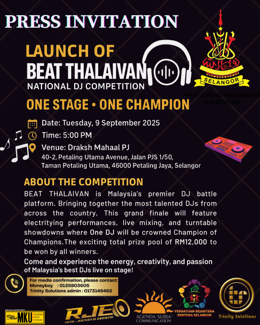 சிலாங்கூரில் தேசிய DJ போட்டியான “தலைவனை வெல்லுங்கள்” இறுதிப் போட்டி RM12,000 ரொக்கப் பரிசுகளுடன் நடைபெறவுள்ளது.