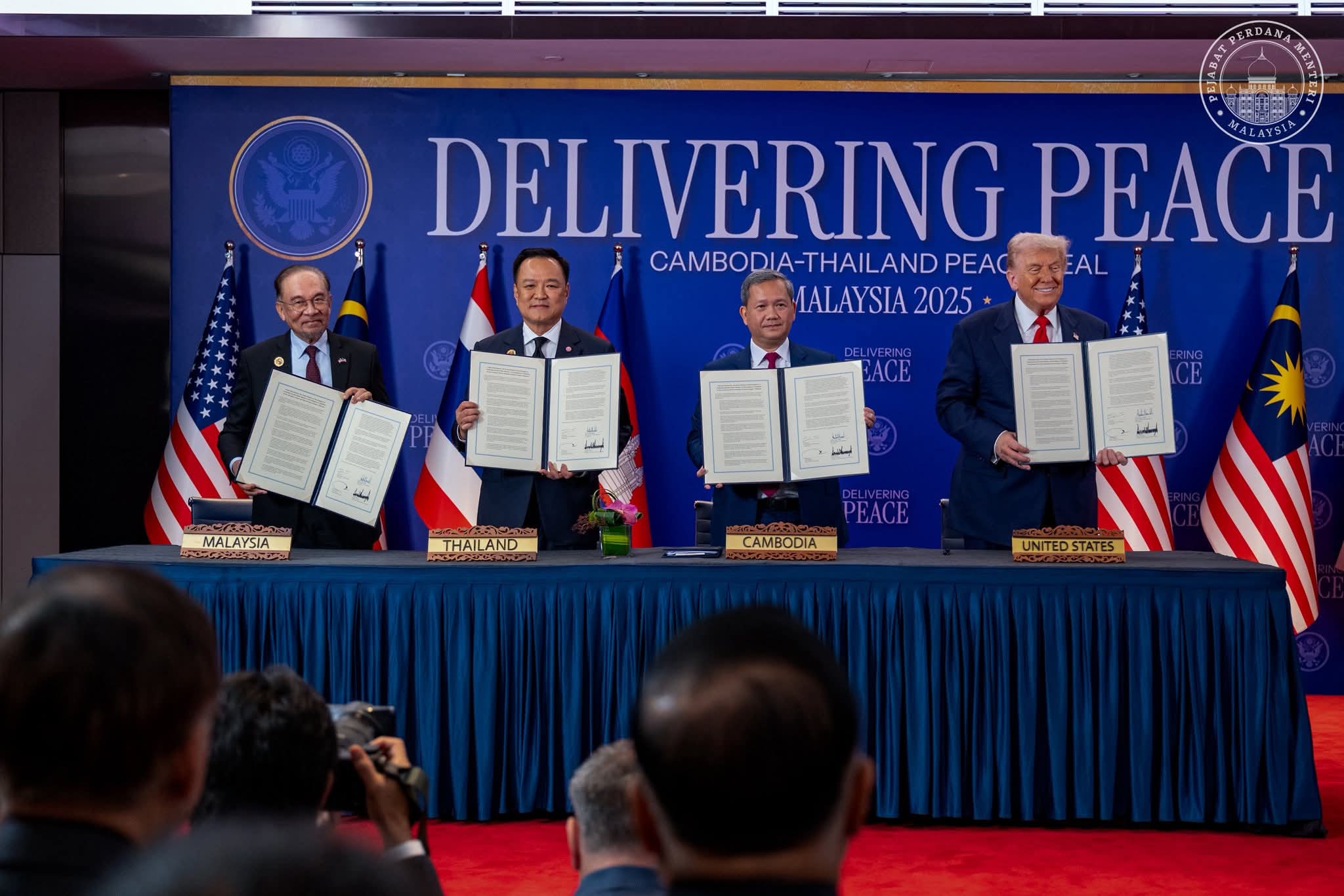 கோலாலம்பூர்— இன்று மலேசியாவில் நடைபெற்ற Association of Southeast Asian Nations (ASEAN) உச்சி சமீகரிப்பு நிகழ்ச்சியில், கம்போடியா ராச்சியத்தின் பிரதமர் Hun Manet மற்றும் தாய்லாந்து ராச்சியத்தின் பிரதமர் Anutin Charnvirakul ஆகியோரால் வரலாற்று “Kuala Lumpur Peace Agreement” என்று அழைக்கப்படும் ஒப்பந்தம் கையெழுத்தானது. இதில் அமெரிக்கா பொறுப்பேற்றுள்ள Donald J. Trump மற்றும் மலேசிய பிரதமர் Anwar Ibrahim ஆகியோரும் முன்னேற்றத்துடன் கலந்து கொண்டனர்.