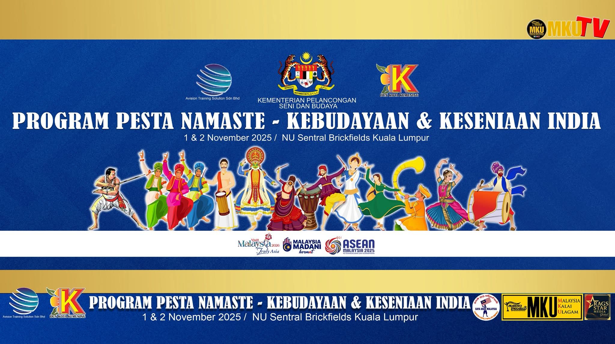 Avision Traming Solution Sdn. Bhd நிறுவனத்தின் இணை ஏற்பாட்டில், மலேசியா சுற்றுலா, கலை மற்றும் கலாச்சார அமைச்சகம் (KEMENTERIAN PELANCONGAN, SENI DAN BUDAYA) ஆதரவில், இந்திய கலாச்சாரத்தின் சிறப்பை வெளிப்படுத்தும் “பேஸ்டா நமஸ்தே – இந்தியக் கலாச்சாரம் மற்றும் கலை விழா” 2025 நவம்பர் 1 மற்றும் 2 ஆம் தேதிகளில் NU Sentral, பிரிக்ஃபீல்ட்ஸ்,