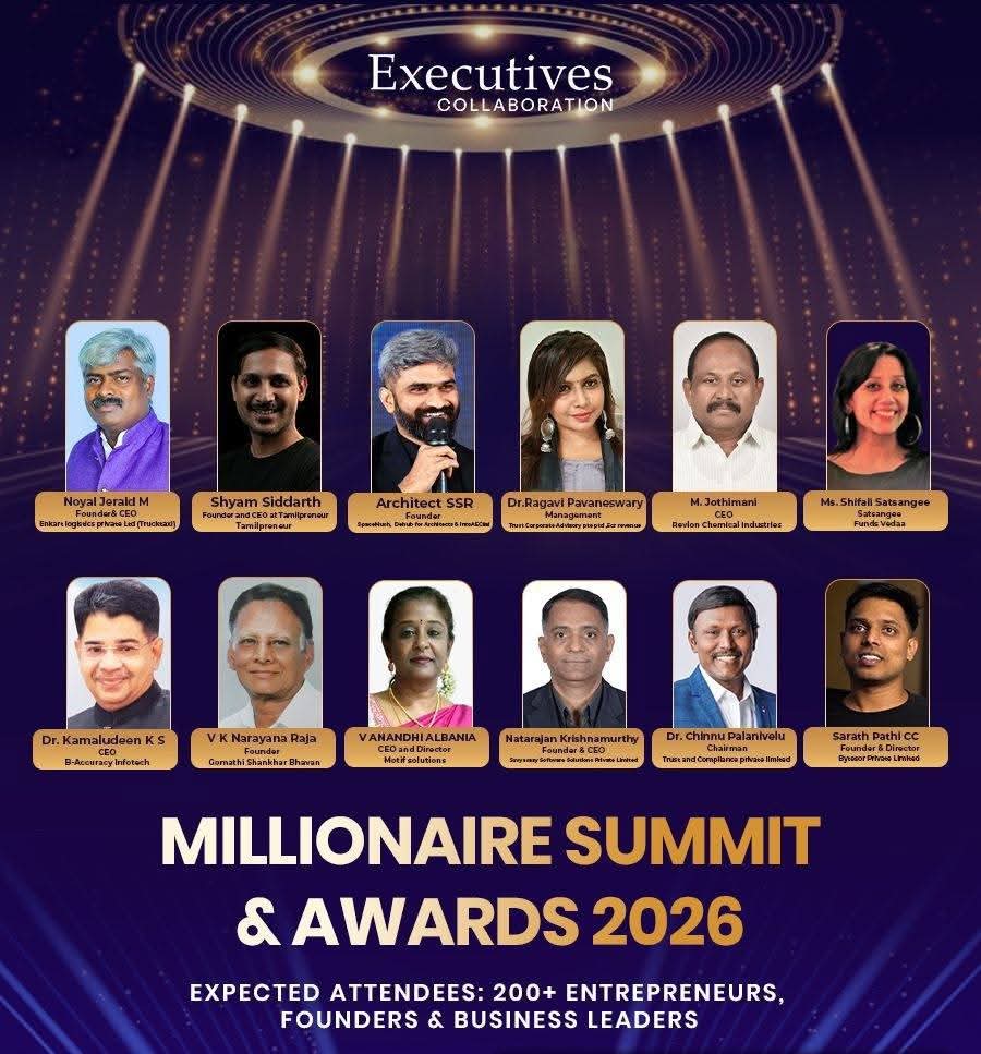 Executives Collaboration – Millionaire Summit & Awards 2026 என்ற சிறப்புமிக்க வணிக மாநாடு மற்றும் விருது வழங்கும் விழா சமீபத்தில் வெற்றிகரமாக நடைபெற்றது. இம்மாநாட்டில் Trust Corporate Advisory Pvt. Ltd நிறுவனத்தின் மேலாண்மை பிரிவைச் சேர்ந்த டாக்டர் ராகவி பவனேஸ்வரி சிறப்பு அழைப்பாளராக கலந்து கொண்டார்.