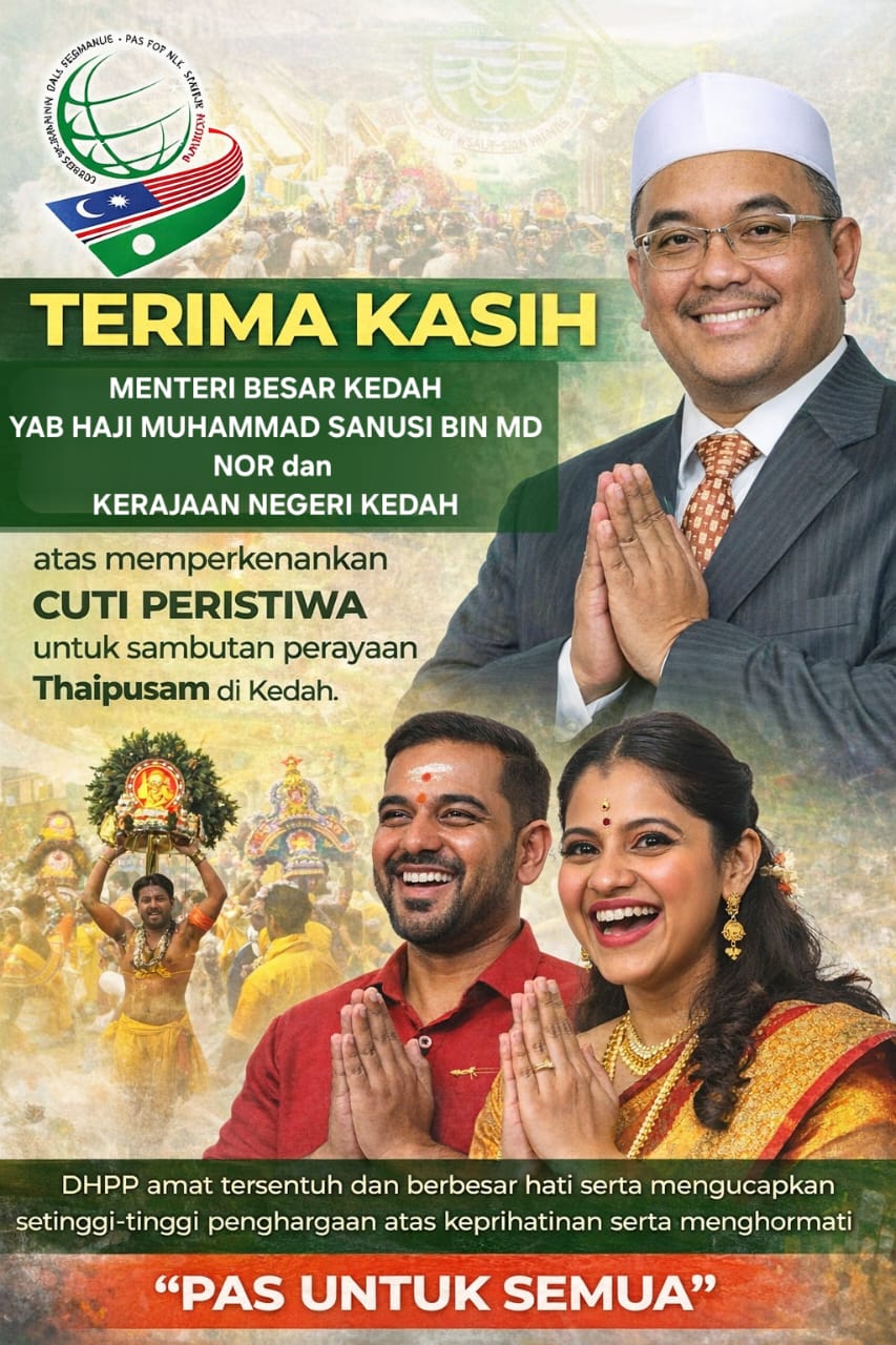 2026 ஆம் ஆண்டு தைப்பூசம் திருநாளை முன்னிட்டு சிறப்பு விடுமுறை (Cuti Peristiwa) வழங்குவதற்கு அனுமதி அளித்த கெடா மாநில அரசுக்கு தனது மனப்பூர்வமான பாராட்டுகளையும் நன்றியையும் தெரிவித்துக்கொள்கிறது.