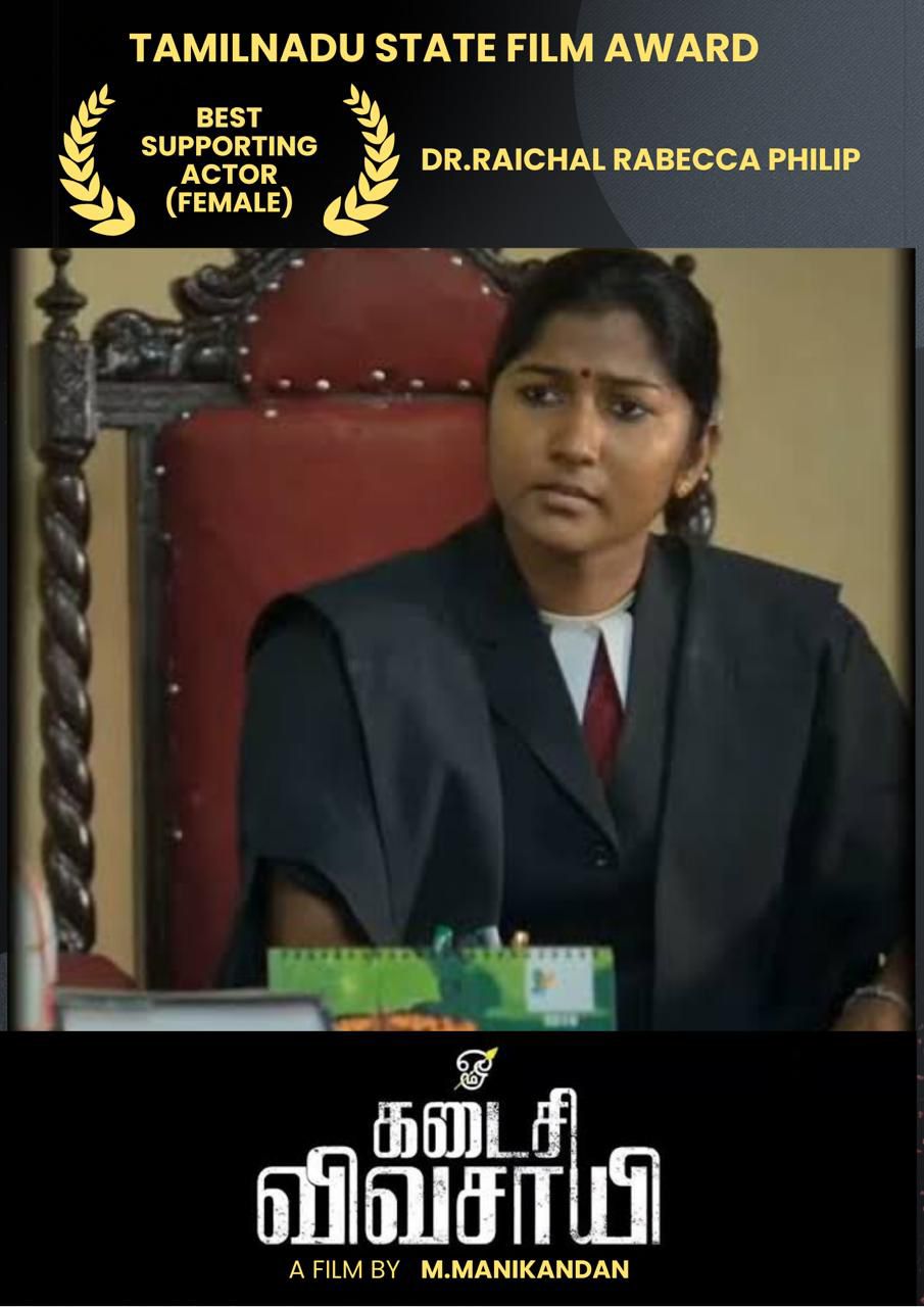 ‘கடைசி விவசாயி’ திரைப்படத்தில் மேஜிஸ்ட்ரேட் மங்கையர்கரசி என்ற கதாபாத்திரத்தை உயிர்ப்புடன் திரையாக்கிய நடிகை டாக்டர் ரேச்சல் ரெபேக்கா, தமிழ்நாடு அரசு வழங்கிய மாநில திரைப்பட விருதை (சிறந்த துணை நடிகை) முழுமனதோடும் தாழ்மையுடனும் ஏற்றுக் கொண்டுள்ளார்.